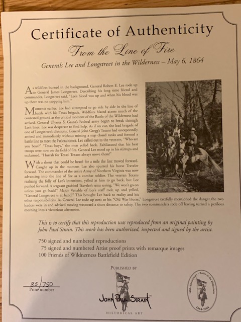 This limited-edition lithograph, From the Line of Fire, depicting Generals Lee and Longstreet at the Battle of the Wilderness, May 6, 1864, will be available at the Silent Auction. The artist is John Paul Strain and it comes with the certificate of authenticity, number 85/750.